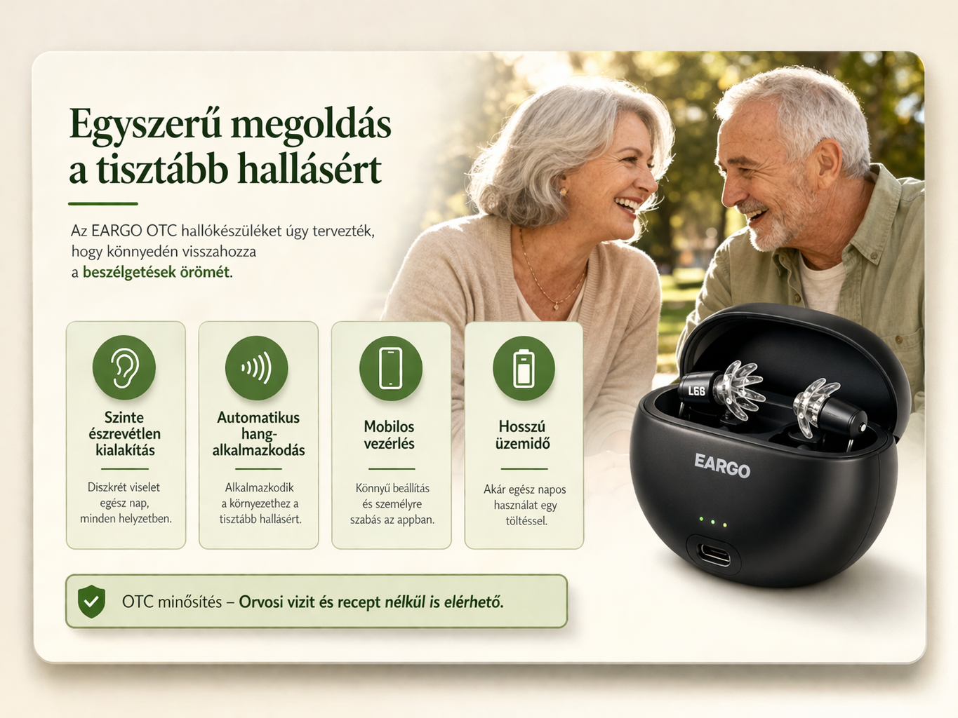 A SIEMENS EARGO projekt kezdete óta a SIEMENS-nél kutatjuk, hogyan tervezzünk kényelmes és diszkrét hallókészülékeket. A hagyományos hallókészülékek összes modern technológiáját és támogatását kínáljuk megfizethetőbb áron. Nem kell kompromisszumot kötni a technológia és a támogatás terén, elég egy új, olcsó, vény nélkül kapható készülékért fizetni. Mert az élet megérdemli, hogy meghallják.